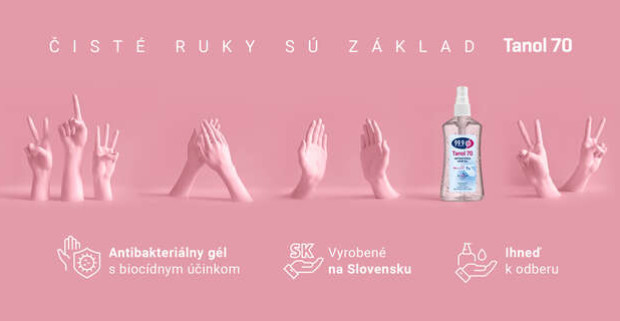 Balenie antibakteriálnych gélov s obsahom 70 % alk. vyrobených na Slovensku.