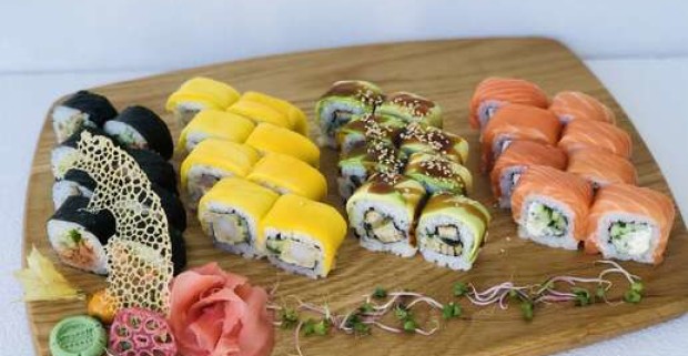 Rainbow sushi set so sebou zo Sushi Bonsai – 16 alebo 32 kúskov.