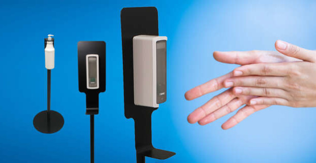 Hygienický bezdotykový dávkovač dezinfekcie a stojany s dávkovačom.
