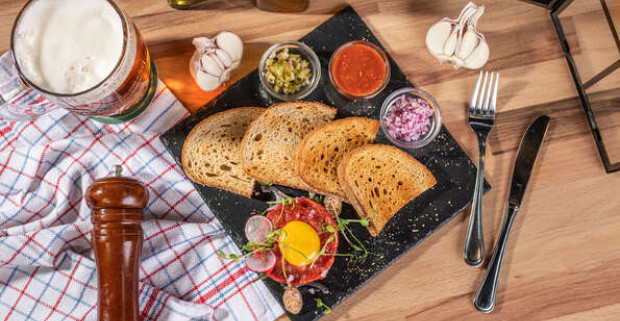 Smíchovský tatarák 150g alebo 300g s hriankami a pivo podľa vlastného výberu.