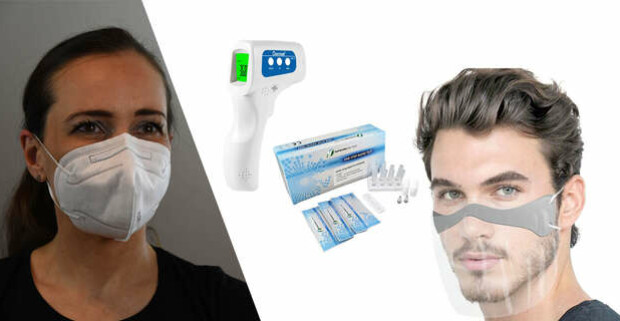 25 ks antigénových výterových testov, respirátor FFP2 5 ks, maska na tvár a nos alebo teplomer.