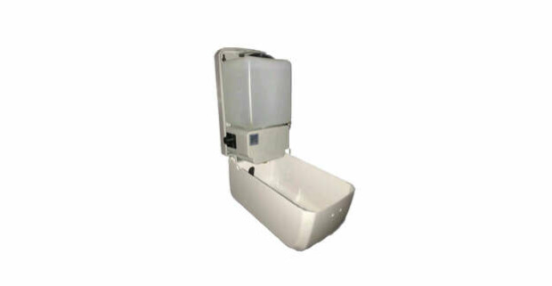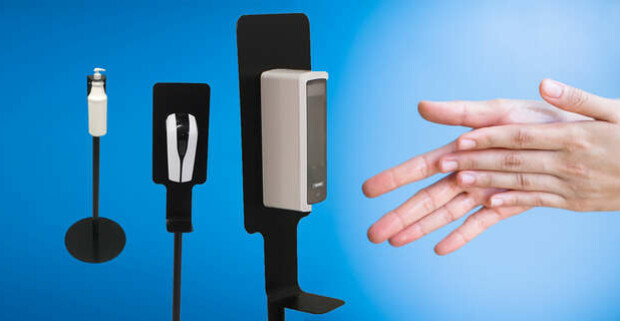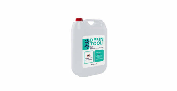 Hygienické bezdotykové dávkovače, stojany a 5 l balenia dezinfekcie Desintool.