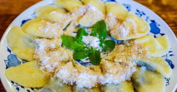 Sladké domáce pirohy so slivkovým lekvárom a tvarohom so sebou "take away".