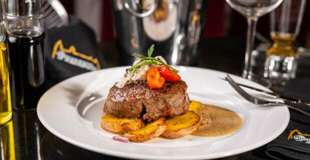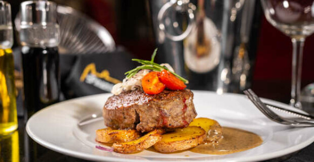 Hovädzí steak, pečené zemiaky na cibuľke s rozmarínom + omáčka podľa výberu.