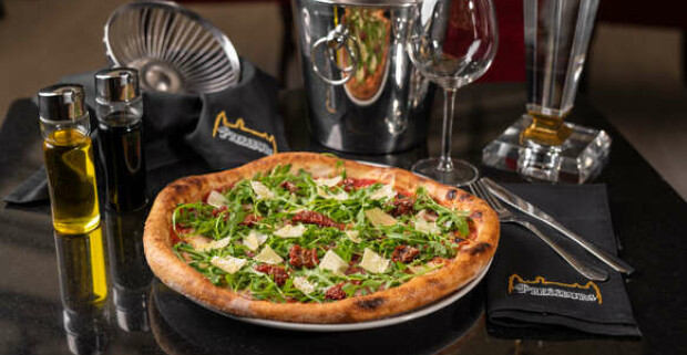 Pizza v Pressburg Prosecco Bar & Restaurant. Šťavnatá, chrumkavá, s cesnakovými okrajmi.
