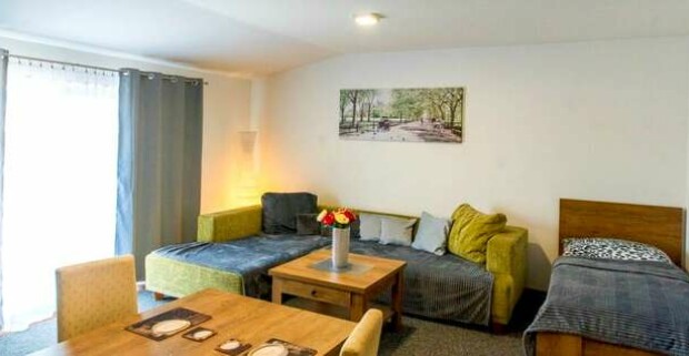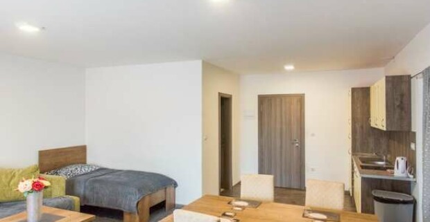 Apartmány majú okrem spálne pripravenú obývaciu miestnosť s TV s káblovým príjmom, gaučom a kompletne zariadeným kuchynským kútikom s posedením.