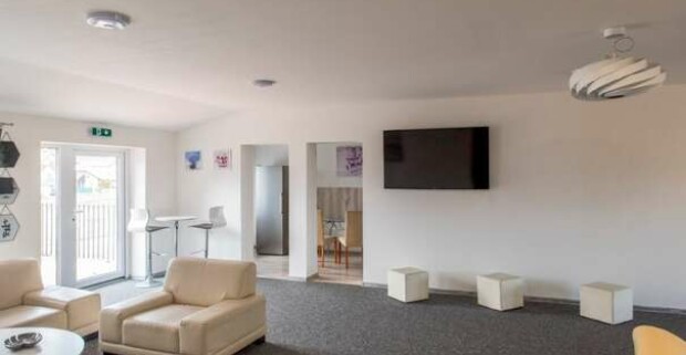 Pre hostí je k dispozícii aj spoločenská miestnosť s gaučovým sedením, TV s káblovým príjmom a kompletne zariadenou kuchyňou, ktorú ocenia predovšetkým hostia ubytovaní v izbách.