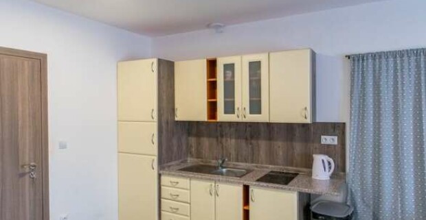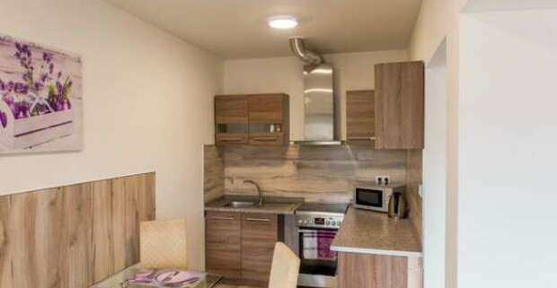 Apartmány majú okrem spálne pripravenú obývaciu miestnosť s TV s káblovým príjmom, gaučom a kompletne zariadeným kuchynským kútikom s posedením.