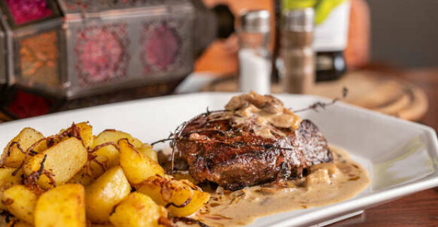 Steak z pravej hovädzej sviečkovice s opekanými zemiakmi a dubákovou omáčkou.
