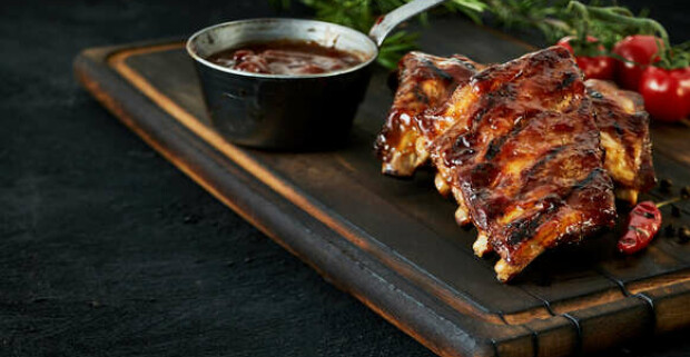 Medové rebrá, hovädzí burger, kurací burger alebo grilované kuracie stehienka.