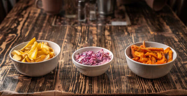 Poctivý hovädzí burger s poriadnou porciou príloh - hranolčeky, coleslaw šalát aj cibuľové krúžky