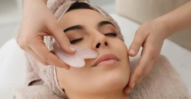 Hyalurónové ošetrenie pleti alebo prirodzený lifting tváre a krku GUA SHA kameňmi.