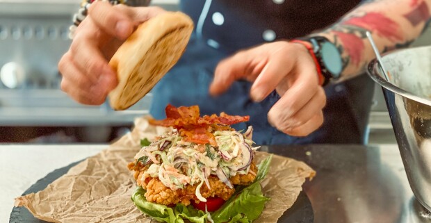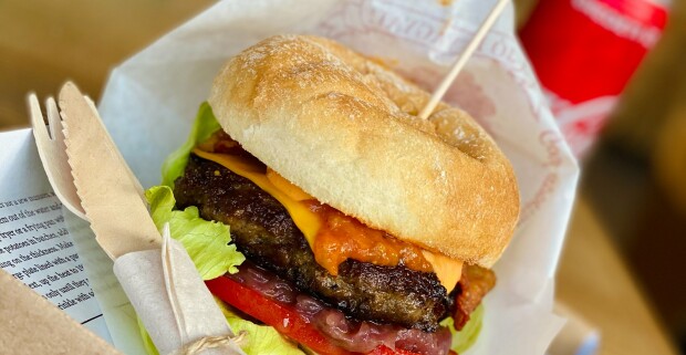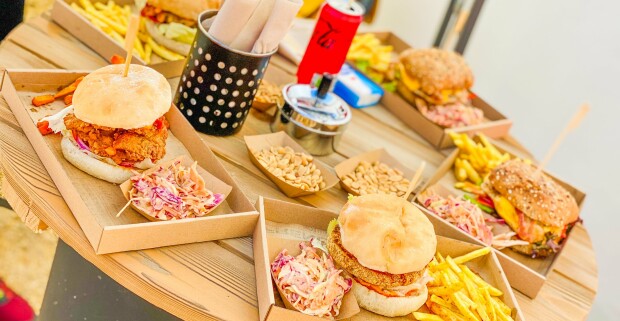 Lahodný hamburger box podľa výberu v reštaurácii BetyárJó falatozó v maďarskom Zalaszentgróte.