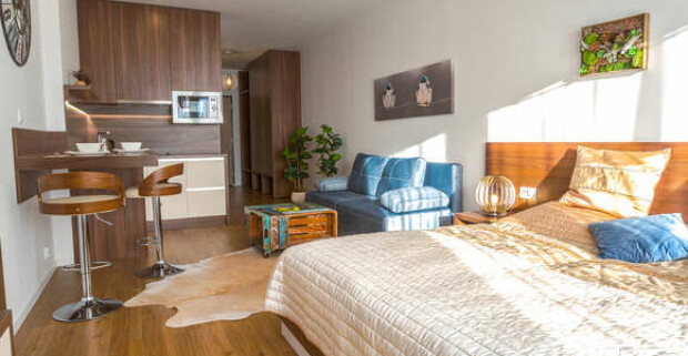 Apartmán 6.2 v Armeria residence je štýlové ubytovanie s pohodlnou posteľou, kuchynským kútom a výhľadom na Kráľovu hoľu.