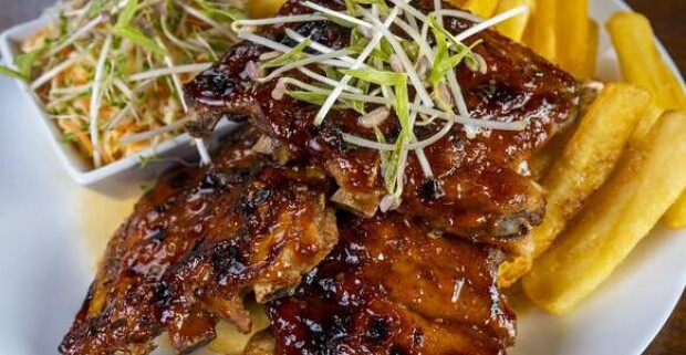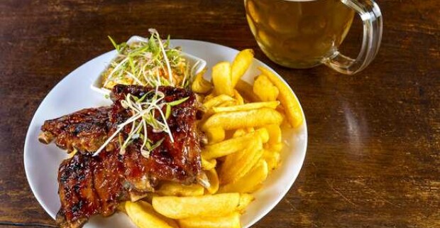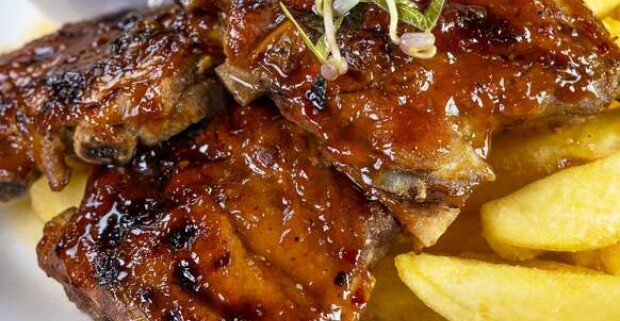 Grilované rebierka, steakové hranolky a šalát coleslaw vo Farmárskom grile.