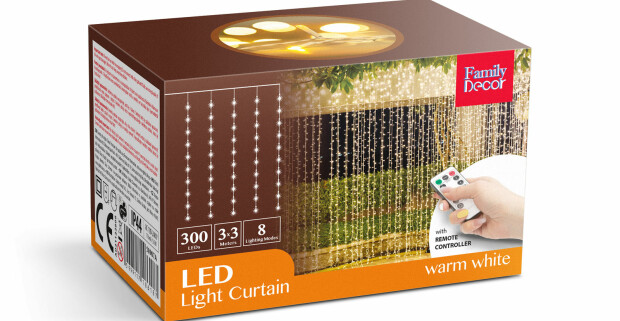 Sveteľný záves - 300 ks teplých bielych LED - 3 x 3 m - 230V - s diaľkovým ovládačom