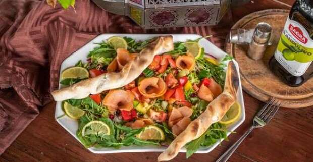 Zeleninový šalát s údeným lososom, olivovým olejom a bagetou v reštaurácii Oáza pri Draždiaku