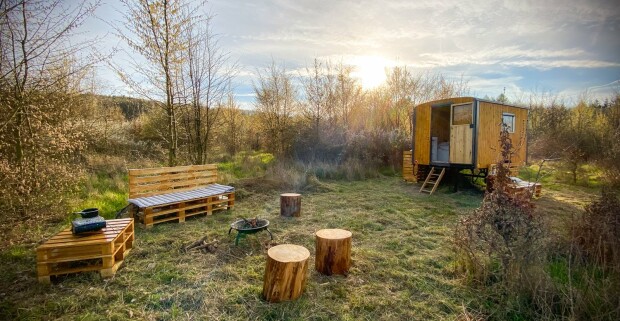 Romantika v prírode: Pobyt pri hradoch Točník a Žebrák v Maringotke Za Trnkou s donáškou raňajok + ohnisko