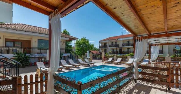 Grécky ostrov Thassos letecky - krásna pláž s bielym pieskom, ubytovanie v štúdiách Porto Marina s vlastným bazénom a polpenziou