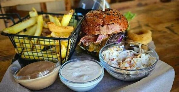 Poctivý hovädzí burger s poriadnou porciou príloh - hranolčeky, coleslaw šalát aj cibuľové krúžky
