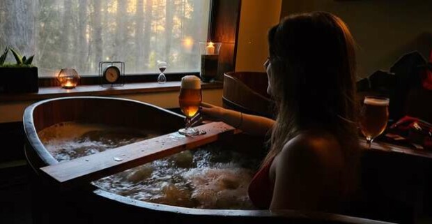 Pivný kúpeľ v drevenej kadi v Drevenice Terchová Resort