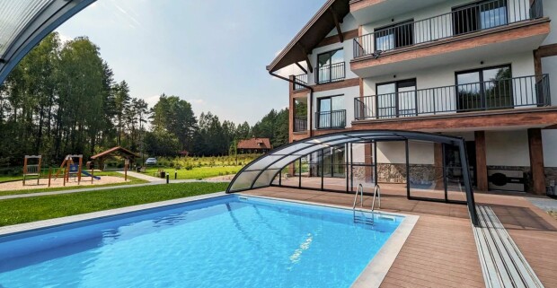 Oblasť Mazurských jazier blízko výletných cieľov: Apartament Karwica Zapach Lasu s bazénom, saunou a ihriskom